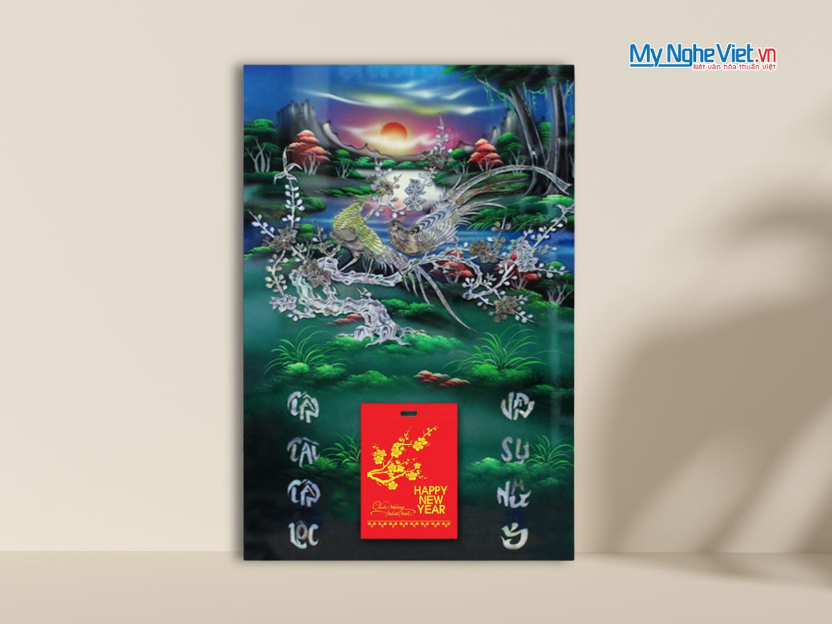 Lịch Sơn Mài Vẽ Chim Và Hoa Cẩn Ốc Nền Xanh